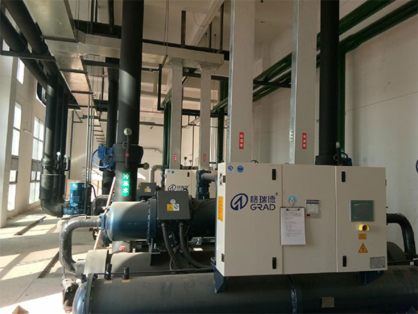 2、水冷螺桿機(jī)組適用于大型制冷量需求的建筑,能效比高,運(yùn)行費(fèi)用低,維護(hù)點(diǎn)少,檢修簡(jiǎn)單,設(shè)立了獨(dú)立機(jī)房不影響車間生產(chǎn)噪音干擾。