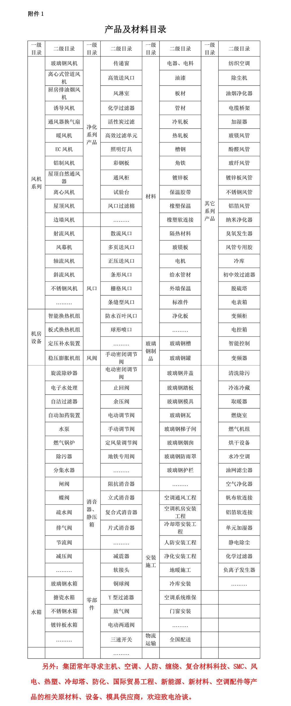 附件一:產(chǎn)品及材料目錄