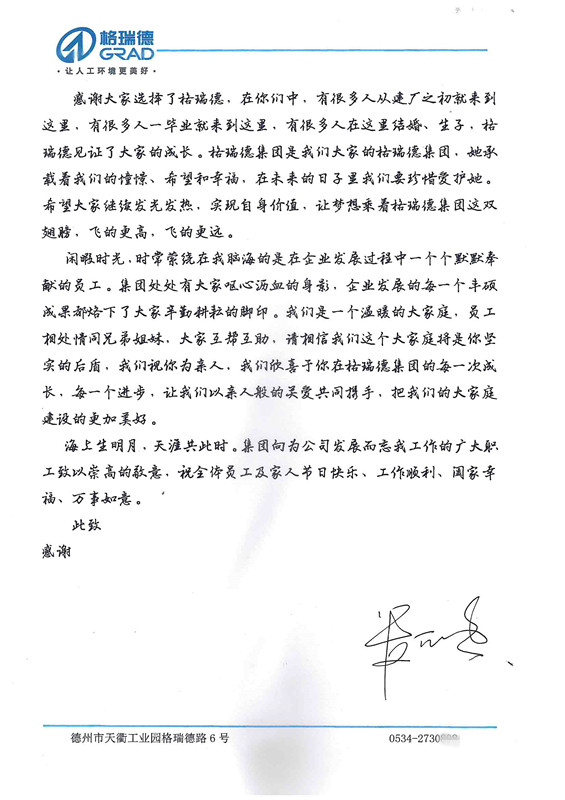格瑞德集團(tuán)93年成立以來(lái),27年的時(shí)間里我們由原來(lái)的德通實(shí)業(yè)發(fā)展為現(xiàn)在的山東格瑞德集團(tuán)有限公司,從單一的玻璃鋼手糊制品發(fā)展為中央空調(diào)、復(fù)合材料、通風(fēng)人防、環(huán)保工程四大系列產(chǎn)品?;仡櫦瘓F(tuán)的發(fā)展歷程,公司前進(jìn)的每一步都有大家流下的汗水,公司取得的榮譽(yù)里飽含著大家的智慧和心血!公司不會(huì)忘記大家為公司的發(fā)展壯大做出的貢獻(xiàn),今天的格瑞德集團(tuán)正站在一個(gè)嶄新的歷史路口,全產(chǎn)業(yè)鏈運(yùn)營(yíng)模式下集團(tuán)不斷改革創(chuàng)新,更需要您一如既往地與公司風(fēng)雨同舟、一路相伴。