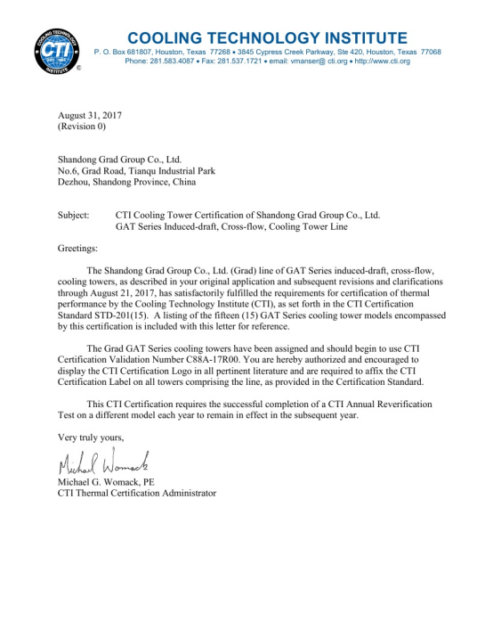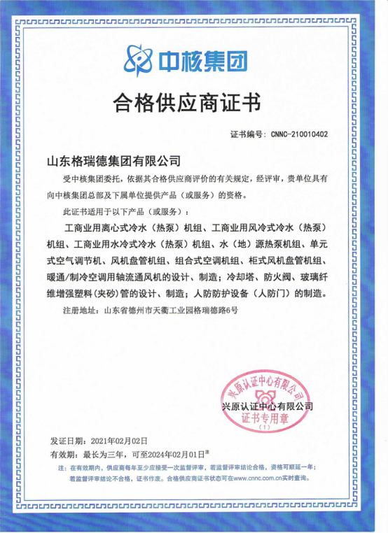 格瑞德冷卻塔公司擁有國家級冷卻塔性能檢測基地,并且入圍中核集團(tuán)合格供應(yīng)商。玻璃鋼橫流冷卻塔(GAT系列)產(chǎn)品均通過了國家級權(quán)威檢測機(jī)構(gòu)的檢測,其中冷卻塔的熱力性能、漂水率、耗電比、噪音等關(guān)鍵技術(shù)指標(biāo)處于國際先進(jìn)水平,取得了美國CTI認(rèn)證、中國節(jié)水產(chǎn)品認(rèn)證、中國節(jié)能產(chǎn)品認(rèn)證、中國冷協(xié)CCTI認(rèn)證。