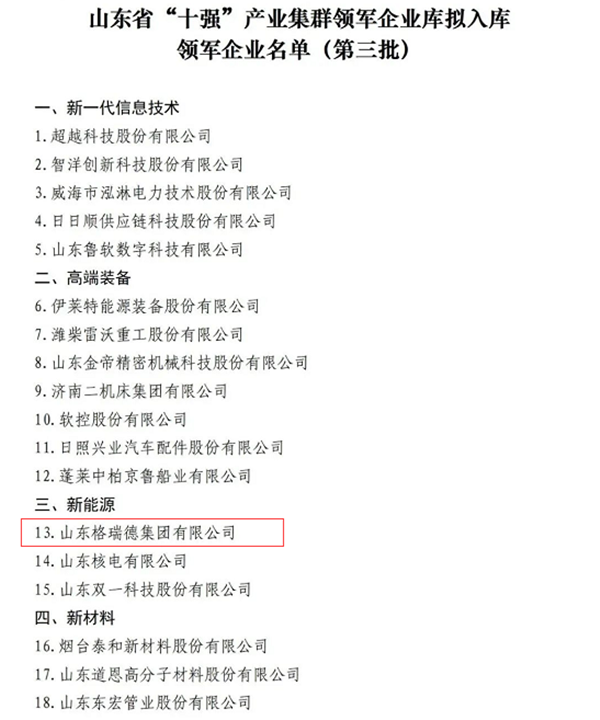 按照全省新舊動能轉換“五年取得突破”工作方案和《“十強”產業(yè)“雁陣形”集群培育支持辦法》《“十強”產業(yè)集群領軍企業(yè)培育支持辦法》有關要求,近期,省發(fā)展改革委會同有關部門公布了2021年度入庫培育的“十強”產業(yè)“雁陣形”集群和集群領軍企業(yè)名單(第三批),山東格瑞德集團有限公司(新能源)入選山東省“十強”產業(yè)集群領軍企業(yè)庫。
