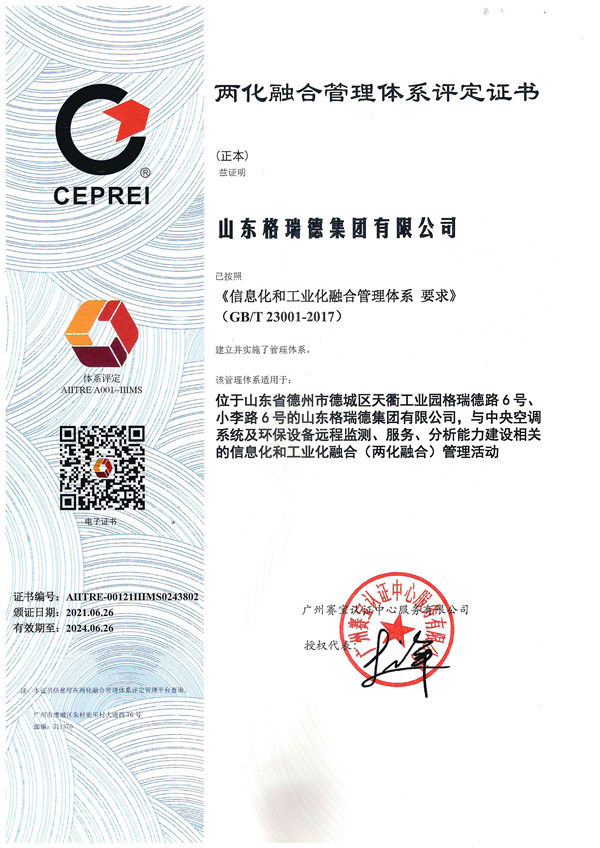 格瑞德集團自2017年起,積極開展兩化融合貫標工作,加大力度投入信息化建設,推動集團業(yè)務發(fā)展。2018年第一次完成兩化融合管理體系認證工作,依托商務運營平臺、U9ERP系統(tǒng)以“供產(chǎn)銷財務一體化管控能力”獲得第一次認證證書,成為德州市前三家獲得此認證的企業(yè)。2021年,集團迎來體系換證工作,再次依托應用物聯(lián)網(wǎng)技術的中央空調(diào)系統(tǒng)運行智能監(jiān)測控制平臺、環(huán)保系統(tǒng)運行智能監(jiān)測控制平臺,以“中央空調(diào)系統(tǒng)及環(huán)保設備遠程監(jiān)測、服務、分析能力”順利獲得認證證書。