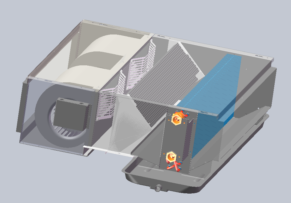 在疫情防控的關鍵期,市面上相繼推出凈化型風機盤管機組,但是這類機組的過濾網(wǎng)都是裝在進風口的,回風箱里是負壓狀態(tài),如果密封不好送風凈化效率將大受影響。針對這一弊端,團隊人員對現(xiàn)有風機盤管機組進行技術(shù)改進,經(jīng)過反復測算,調(diào)整測試,確定將過濾網(wǎng)放置于風機表冷器之間的正壓區(qū),這樣就保證了送到風口的風都是凈化過濾后的,凈化效率大大提升。