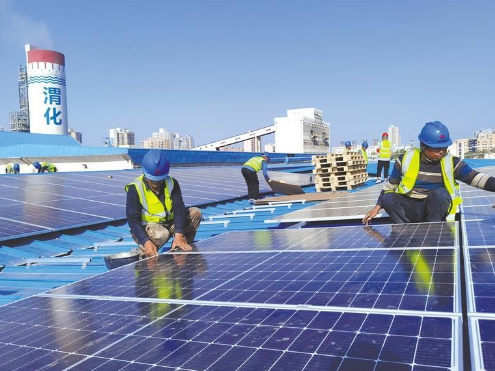 夏日里,在陜煤集團(tuán)陜西渭河煤化工集團(tuán)有限責(zé)任公司(以下簡稱渭化集團(tuán))尿素車間大棚屋頂上,一排排光伏發(fā)電板在陽光下泛著耀眼的光,猶如一片藍(lán)色海洋。施工人員正在加緊建設(shè),他們將利用公司的尿素車間大棚屋頂建設(shè)近2萬平方米的光伏項目。