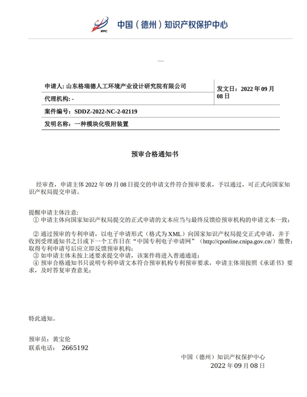 該專利是中國(德州)知識產(chǎn)權(quán)保護中心開展快速預審服務以來集團首件獲得國家授權(quán)的專利,標志著集團在自主創(chuàng)新之路上實現(xiàn)了“格瑞德速度”。預審合格后,8月31日該專利申請被正式提交至國家知識產(chǎn)權(quán)局,9月8日即獲得授權(quán)。與一般實用新型專利常規(guī)審查程序所需的8個月左右相比,授權(quán)周期大幅縮減。格瑞德人工環(huán)境產(chǎn)業(yè)設(shè)計研究院近日提交的“一種模塊化吸附裝置”專利文件,也已順利通過保護中心預審,進入國家專利局快速審查通道。本月還將有兩項發(fā)明專利通過保護中心快速預審平臺提交,為集團知識產(chǎn)權(quán)快速確權(quán)提供新引擎。