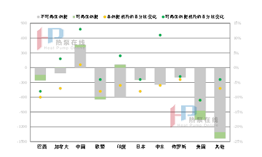 據(jù)國際能源署(IEA)統(tǒng)計(jì)數(shù)據(jù),圖3-8給出了7個(gè)國家或地區(qū)工業(yè)用熱量同比變化,受疫情影響,除中國外其他國家或地區(qū)2020年的工業(yè)熱能消耗較之于2019年有不同幅度的降低;而中國經(jīng)濟(jì)復(fù)蘇表現(xiàn)強(qiáng)勁,工業(yè)用不可再生熱能以及可再生熱能消耗量分別提高了412×106GJ、50×106GJ,同比增長(zhǎng)1%及13%。根據(jù)該數(shù)據(jù)估計(jì),2020年中國工業(yè)用可再生熱量?jī)H占工業(yè)用總熱能消耗的0.83%。顯然,碳中和目標(biāo)的達(dá)成過程中的可再生熱量的比例遠(yuǎn)遠(yuǎn)不足,必須對(duì)高耗能行業(yè)的工藝流程進(jìn)行根本性的改變。工業(yè)轉(zhuǎn)型最前沿的脫碳選擇是:通過提高工藝效率和新工藝來減少最終能源消耗,余熱回收以及使用可再生能源代替化石能源。這里,熱泵技術(shù)能夠作為工業(yè)部門碳中和的解決方案之一,為我國工業(yè)部門減少二氧化碳排放提供一條可行的路徑。