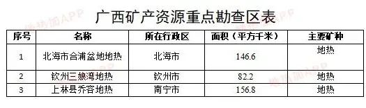 《規(guī)劃》以戰(zhàn)略性礦產(chǎn)、優(yōu)勢(shì)礦產(chǎn)、產(chǎn)業(yè)發(fā)展急需礦產(chǎn)為重點(diǎn),劃定了40個(gè)重點(diǎn)勘查區(qū),其中有三個(gè)片區(qū)涉及地?zé)豳Y源,包括北海市合浦盆地地?zé)?、欽州三娘灣地?zé)?、上林縣喬容地?zé)?,總面積達(dá)385.6平方千米。