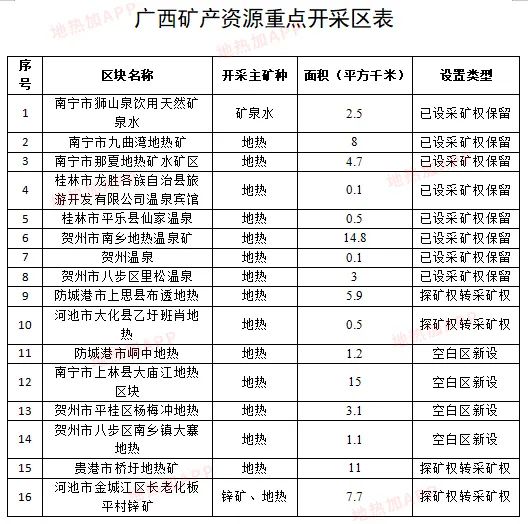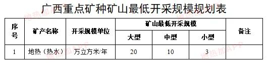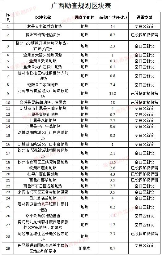 最后,《規(guī)劃》以附件形式發(fā)布了廣西礦產(chǎn)資源重點(diǎn)勘查區(qū)表、廣西勘查規(guī)劃區(qū)塊表、廣西礦產(chǎn)資源重點(diǎn)開(kāi)采區(qū)表、廣西重點(diǎn)礦種礦山最低開(kāi)采規(guī)模規(guī)劃表等,對(duì)廣西礦產(chǎn)資源區(qū)塊進(jìn)行了詳細(xì)的統(tǒng)計(jì)與劃分,其中涉及大量的地?zé)崽镔Y源。