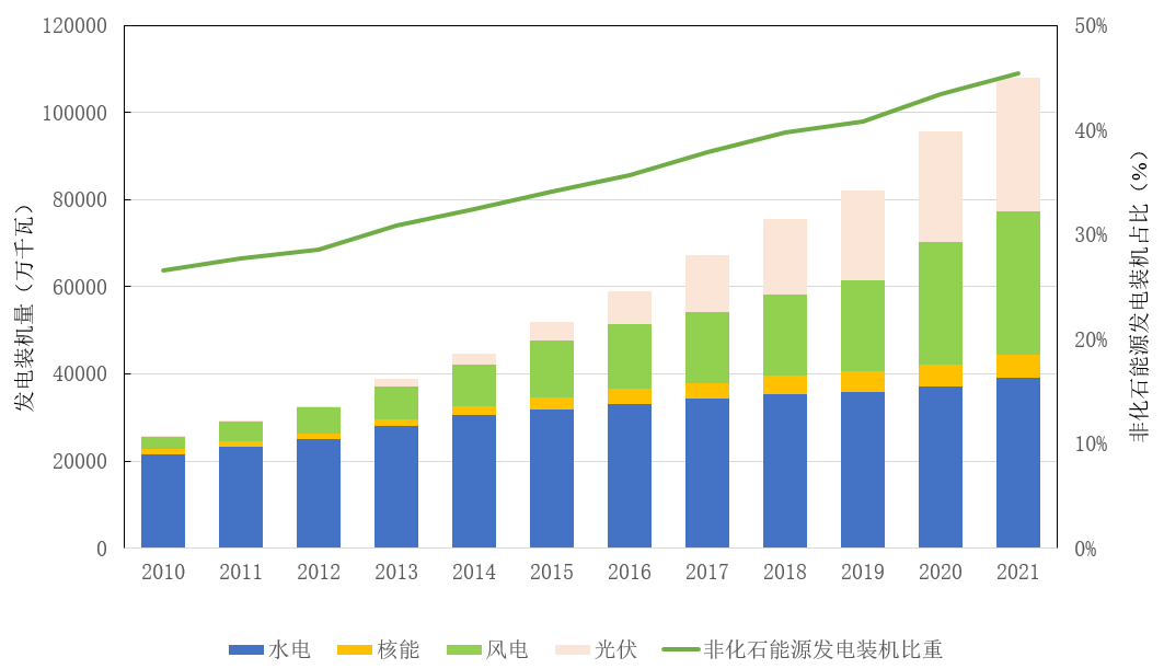 2021年,我國非化石能源占能源消費比重達到16.6%,風(fēng)電、太陽能發(fā)電總裝機容量達到 6.35 億千瓦,單位GDP煤炭消耗顯著降低。