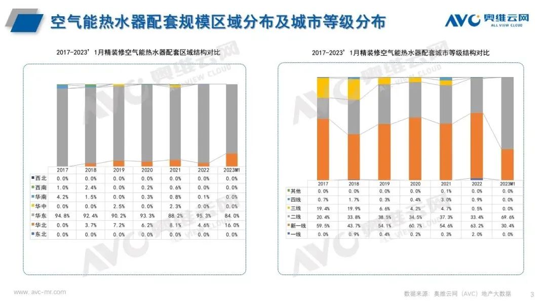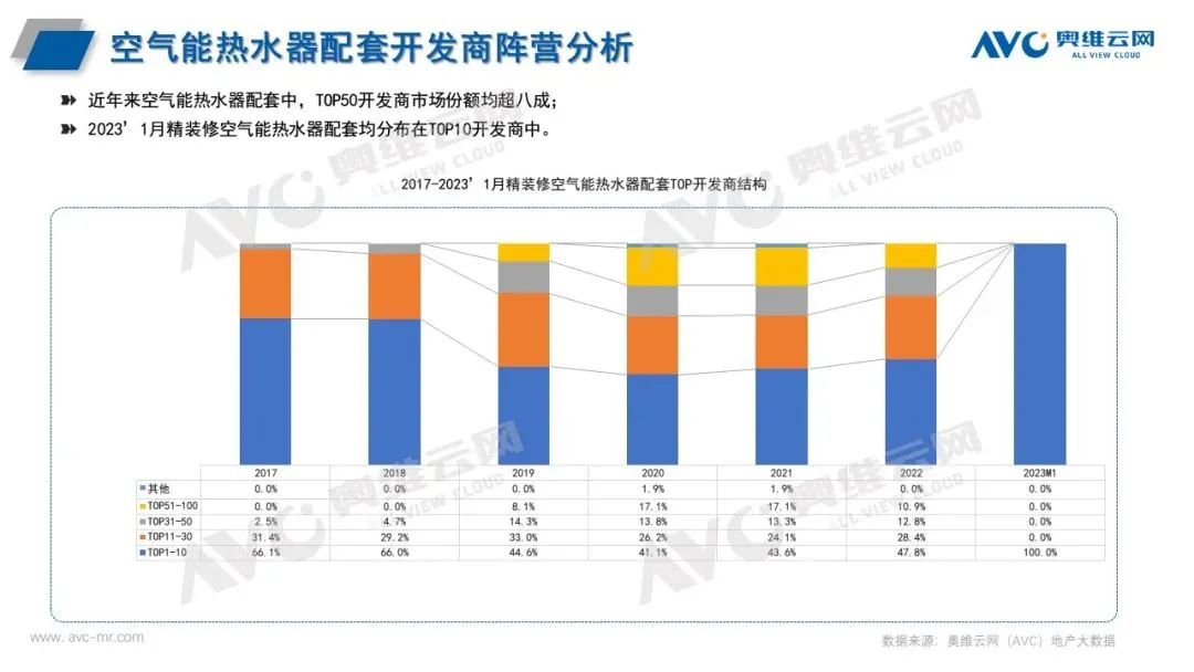 從近年空氣能熱水器市場來看,近年來空氣能熱水器主力戰(zhàn)場始終是華東區(qū)。從近年城市等級分布來看,空氣能熱水器集中分布在新一線城市和二線城市中,合計份額均在七成以上,從單個城市來看,近年來空氣能熱水器重點城市主要為杭州,寧波、紹興、溫州等,從開發(fā)商陣營來看,近年來空氣能熱水器配套中,TOP50開發(fā)商市場份額均超八成,其中TOP10開發(fā)商市場份額均為40%以上, 2023年1月精裝修市場空氣能熱水器配套均分布在TOP10開發(fā)商中。