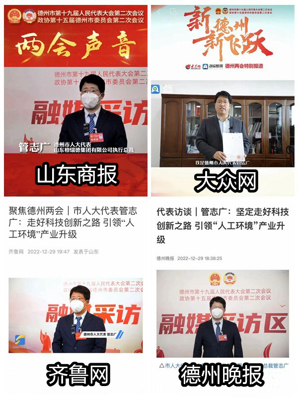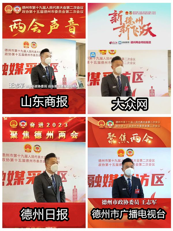 集團執(zhí)行總裁管志廣、總經(jīng)理王志軍在大會期間積極建言,代表德州企業(yè)出謀劃策,受到多家媒體的關注。齊魯網(wǎng)、大眾網(wǎng)、山東商報、德州晚報、德州電視臺、德州日報等多家媒體分別進行了專訪,形成宣傳稿件、宣傳視頻達十三起。兩位領導積極通過媒體發(fā)聲諫言,充分展現(xiàn)集團2022年的發(fā)展成果及彰顯格瑞德集團勇?lián)圃鞓I(yè)科技創(chuàng)新大任的魄力。