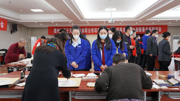 格瑞德集團(tuán)董事長(zhǎng)助理、公共管理中心總監(jiān)白曉云,德州市董子文化研究會(huì)執(zhí)行主席、省運(yùn)河經(jīng)濟(jì)文化研究中心德州聯(lián)絡(luò)處主任、《環(huán)境與生活》雜志社副總編麻然松,德州市董子文化研究會(huì)副主席、德州市委統(tǒng)戰(zhàn)部原副部長(zhǎng)鄒巖、德州市長(zhǎng)河書畫家協(xié)會(huì)周淑云會(huì)長(zhǎng)等領(lǐng)導(dǎo)出席活動(dòng),對(duì)老藝術(shù)家的奉獻(xiàn)和愛(ài)心表示了感謝。大家表示,以書畫的形式迎接2023年春節(jié)很有意義。