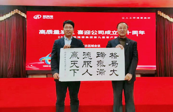 會議最后,南方大區(qū)總經(jīng)理曹大軍和湖北分公司總經(jīng)理張文橋進行年初責任狀簽字儀式,集團執(zhí)行總裁管志廣授旗,湖北分公司總經(jīng)理張文橋帶領(lǐng)湖北分公司全體員工進行出征宣誓,湖北省制冷協(xié)會秘書長張定國贈予墨寶藏頭詩賀詞,本次客戶聯(lián)誼會圓滿結(jié)束。