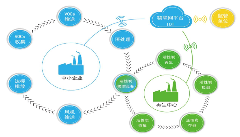 該模式已經成功應用于眾多中小企業(yè)的VOCs治理工程,工程建設運行實踐表明,該模式使分散的、間歇排放的、難以原位再生的中小風量有機廢氣得到凈化,達成完整的治理閉環(huán)模式,處理效率高,廢氣達標排放,投資運維費用低,同時可以減少固體廢棄物的產生、降低企業(yè)的污染治理成本,實現(xiàn)活性炭資源的循環(huán)利用和全生命周期管理,社會、經濟、生態(tài)效益顯著。