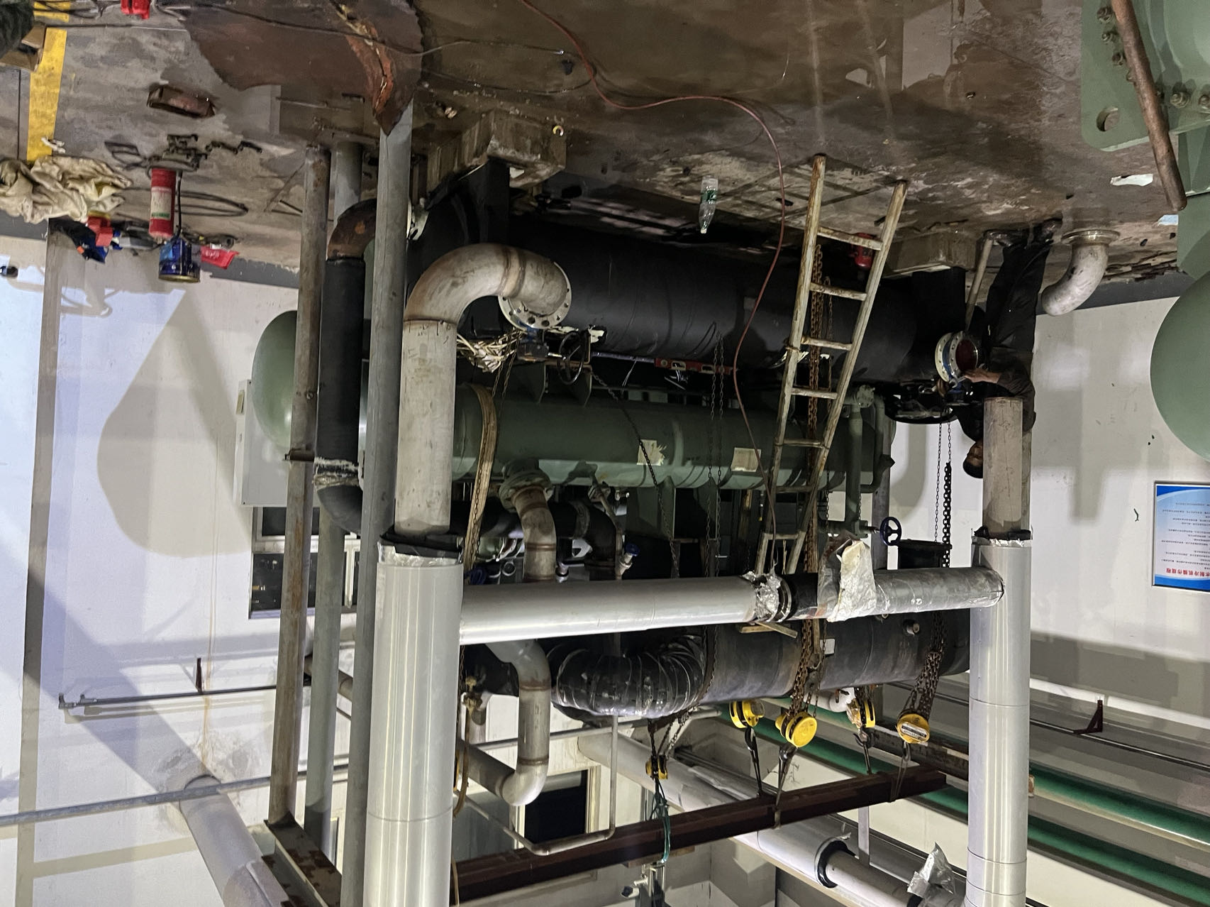 現(xiàn)場(chǎng)使用的南京五洲海水源水冷螺桿機(jī)組共有 3 臺(tái),自 2015 年投入使用后,由于冷凝器長(zhǎng)期接觸海水,受到嚴(yán)重腐蝕,導(dǎo)致?lián)Q熱器內(nèi)的銅管損壞。格瑞德公司根據(jù)現(xiàn)場(chǎng)的實(shí)際情況,重新為其制作了具有更強(qiáng)耐腐蝕性的換熱器,采用了復(fù)合端板以及鎳白銅銅管。這一舉措有效解決了海水腐蝕的問(wèn)題,延長(zhǎng)了設(shè)備的使用壽命,保障了機(jī)組的正常運(yùn)行。