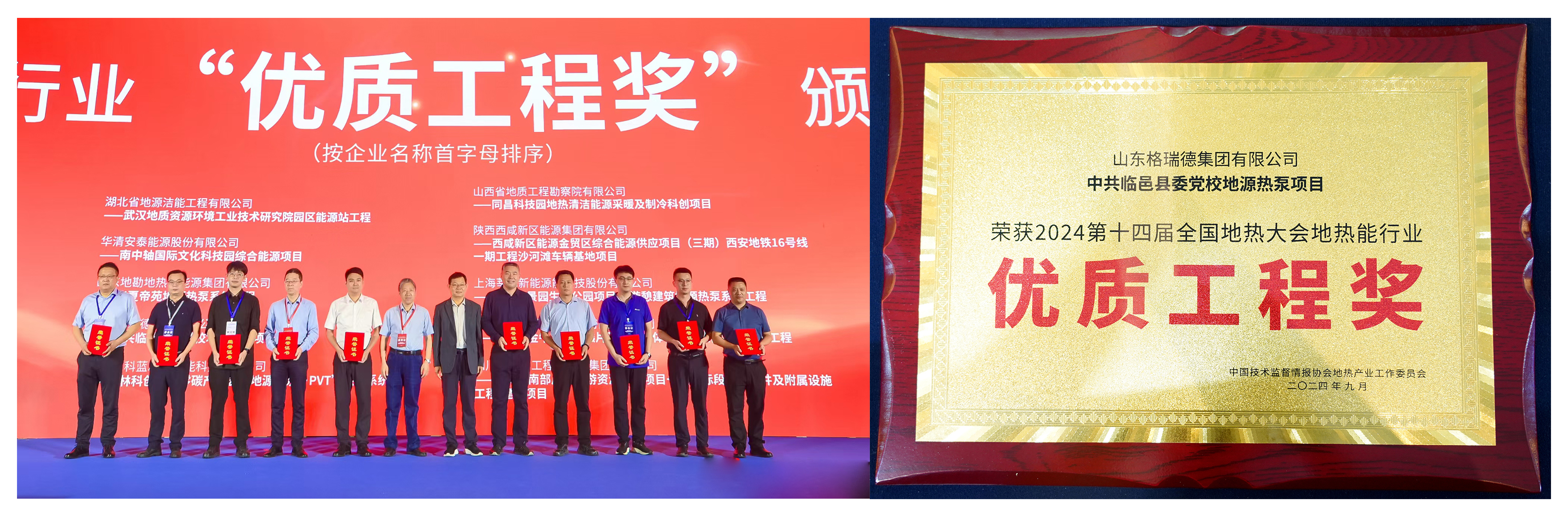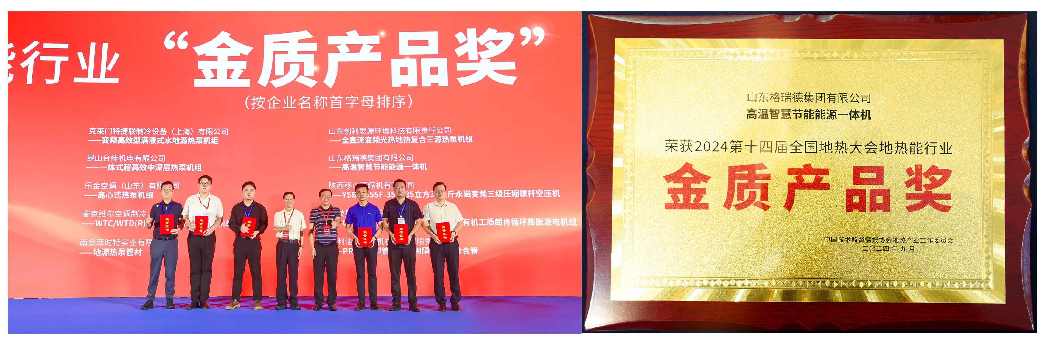 值得一提的是,集團(tuán)在本次大會(huì)上憑借“高溫智慧節(jié)能能源一體機(jī)”獲得地?zé)崮苄袠I(yè)金質(zhì)產(chǎn)品獎(jiǎng),“中共臨邑縣委黨校地源熱泵項(xiàng)目”獲得地?zé)崮苄袠I(yè)優(yōu)質(zhì)工程獎(jiǎng)。兩個(gè)獎(jiǎng)項(xiàng)的獲得,標(biāo)志著集團(tuán)不僅在地?zé)岙a(chǎn)品制造方面成就卓越,在系統(tǒng)工程承攬方面也具備超強(qiáng)實(shí)力,再次彰顯格瑞德集團(tuán)在地?zé)嵝袠I(yè)的重要地位。