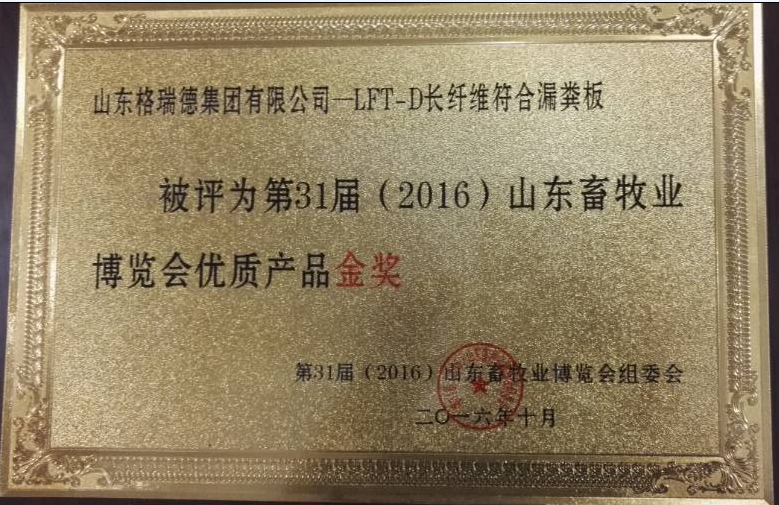 此次博覽會(huì)上,我公司展出了新型復(fù)合材料制品—畜牧業(yè)養(yǎng)殖用LFT-D長(zhǎng)纖維復(fù)合材料漏糞板,該產(chǎn)品作為漏糞板的更新?lián)Q代產(chǎn)品在展會(huì)上格外搶眼,并榮膺此次博覽會(huì)組委會(huì)評(píng)選之最高獎(jiǎng)—金獎(jiǎng),成為我公司的一大榮耀。
