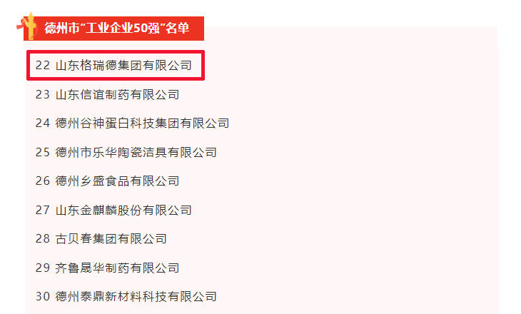 2月,德州市民營經(jīng)濟(jì)高質(zhì)量發(fā)展暨優(yōu)化營商環(huán)境大會召開。格瑞德集團(tuán)憑借卓越的企業(yè)實力和持續(xù)的創(chuàng)新發(fā)展榮登德州市“工業(yè)企業(yè)50強”榜單。