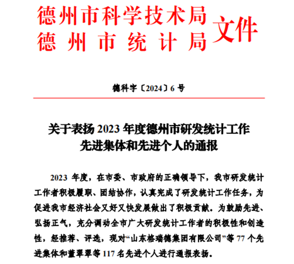 2月,德州市科學(xué)技術(shù)局、德州市統(tǒng)計局聯(lián)合召開2024年度德州市研發(fā)統(tǒng)計工作會議。會議公示表揚了2023年度研發(fā)統(tǒng)計工作先進(jìn)集體和先進(jìn)個人。格瑞德集團(tuán)憑借卓越的研發(fā)創(chuàng)新實力,成功榮獲“研發(fā)統(tǒng)計工作先進(jìn)集體”稱號。