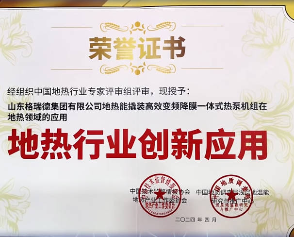 4月,格瑞德集團(tuán)受邀參加2024四川(成都)地?zé)岣哔|(zhì)量發(fā)展大會,會上集團(tuán)憑借地?zé)崮芮搜b高效變頻降膜一體式熱泵機組在地?zé)犷I(lǐng)域的卓越應(yīng)用,經(jīng)過中國地?zé)嵝袠I(yè)專家評審組的嚴(yán)格評審,榮獲地?zé)嵝袠I(yè)創(chuàng)新應(yīng)用獎。