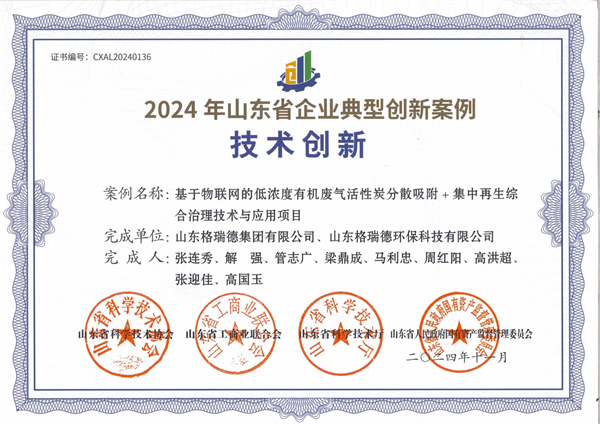 11月,山東省科學(xué)技術(shù)協(xié)會公示2024年山東省企業(yè)典型創(chuàng)新案例入選名單,格瑞德集團(tuán)與環(huán)??萍脊竟餐邪l(fā)的“基于物聯(lián)網(wǎng)的低濃度有機廢氣活性炭分散吸附+集中再生綜合治理技術(shù)與應(yīng)用項目” 憑借在有機廢氣治理方面的先進(jìn)性和創(chuàng)新性成功入選。