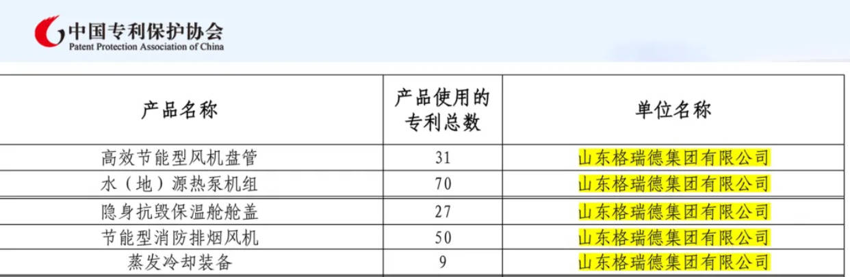 格瑞德集團水(地)源熱泵機組、高效節(jié)能型風機盤管、節(jié)能型消防排煙風機、蒸發(fā)冷卻裝備、隱身抗毀保溫艙艙蓋5個產(chǎn)品入選國家專利密集型產(chǎn)品。格瑞德集團產(chǎn)品的成功認定不僅激發(fā)了集團新動力,增添了新動能,也體現(xiàn)了集團專利工作的顯著成果。