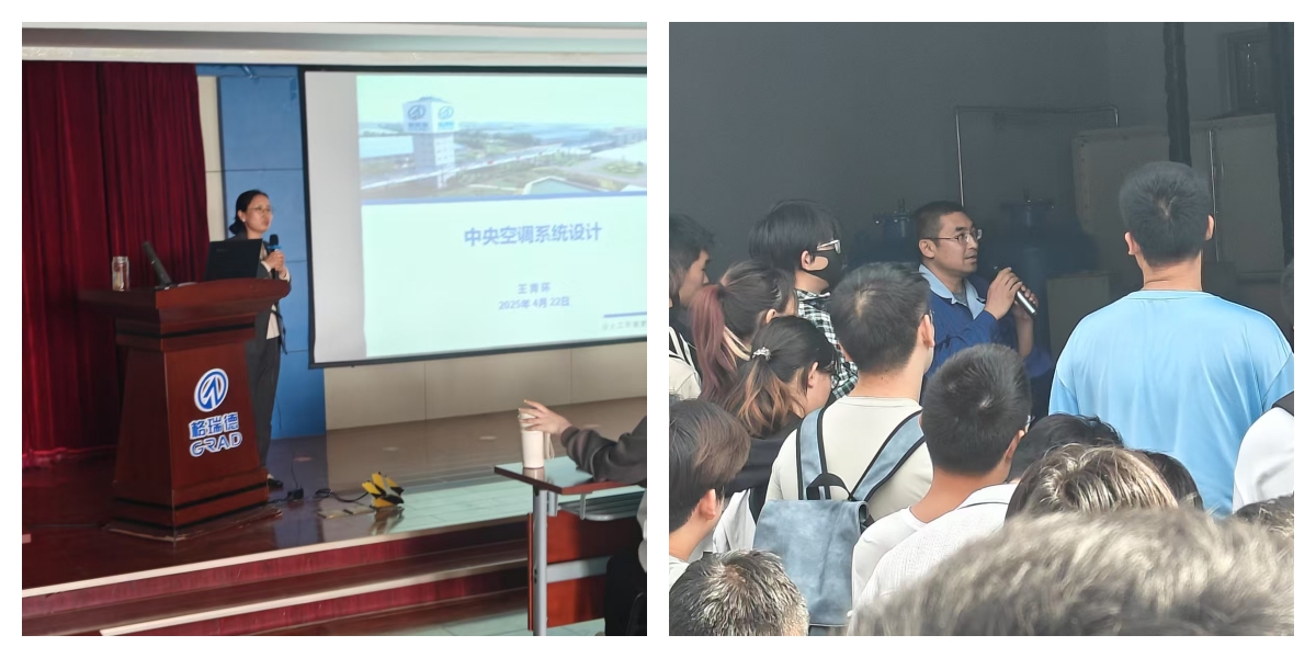 格瑞德環(huán)境科技公司系統(tǒng)工程組的王青環(huán)、劉立志則聚焦中央空調(diào)系統(tǒng),為學(xué)生們進(jìn)行了系統(tǒng)講解及圖紙設(shè)計演示。技術(shù)總工劉立志更是親自帶領(lǐng)學(xué)生們走進(jìn)中央空調(diào)機(jī)房,讓大家近距離觀察設(shè)備的運行情況,進(jìn)一步加深對專業(yè)知識的理解。