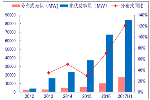 政策傾斜。根據(jù)《電力發(fā)展“十三五”規(guī)劃》,到2020年太陽能發(fā)電裝機達到110GW以上,其中分布式光伏60GW以上、光熱發(fā)電5GW。能源局在發(fā)布的《太陽能發(fā)展“十三五”規(guī)劃》中提出,到2020年建成100個分布式光伏應(yīng)用示范區(qū),園區(qū)內(nèi)80%的新建建筑屋頂、50%的已有建筑屋頂將安裝光伏發(fā)電,粗略估算分布式項目產(chǎn)值約萬億。為響應(yīng)國家號召,多個省市地區(qū)紛紛頒布利好行業(yè)發(fā)展的補貼政策,2017年分布式光伏市場蓬勃發(fā)展,新產(chǎn)品、新模式、新業(yè)態(tài)層出不窮。