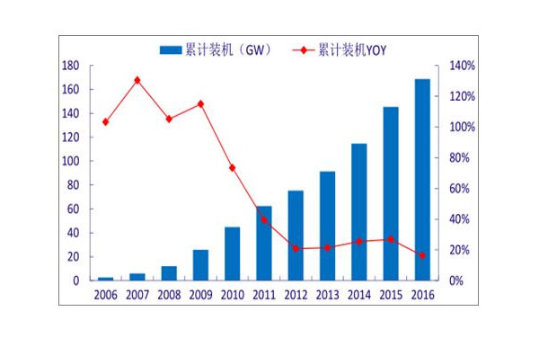 2006至2016年間,我國風電行業(yè)以年復(fù)合52.14%的速度迅速成長。2010年裝機規(guī)模首次超過美國。此后,我國繼續(xù)保持領(lǐng)先地位,與其他國家逐漸拉開差距。據(jù)統(tǒng)計,2016年底中國累計風電裝機已達到168.73GW,占全球比重高達34.48%。