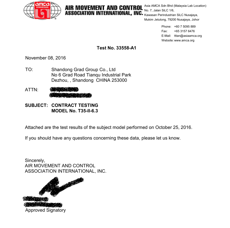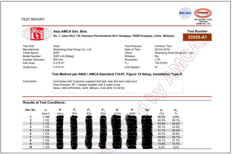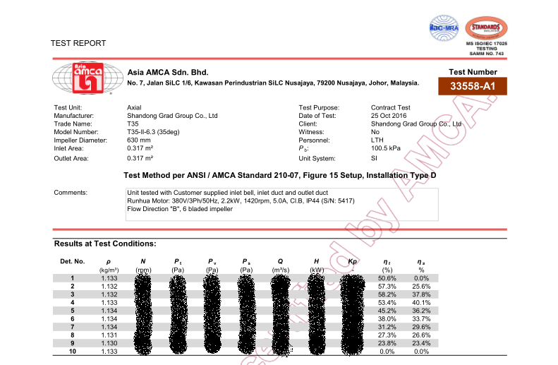 此次集團(tuán)正在申報(bào)辦理的SWF系列、T35系列風(fēng)機(jī)CRP產(chǎn)品性能認(rèn)證,已由AMCA亞洲區(qū)域馬來西亞實(shí)驗(yàn)室完成空氣動(dòng)力性能、噪音測(cè)試工作,測(cè)試結(jié)果均合格,風(fēng)機(jī)能效等級(jí)分別達(dá)到FEG67、FEG60,充分顯示了格瑞德集團(tuán)風(fēng)機(jī)產(chǎn)品的優(yōu)異性能,為產(chǎn)品獲得最終認(rèn)證奠定了基礎(chǔ),也為風(fēng)機(jī)系列產(chǎn)品進(jìn)軍國際市場(chǎng)拿到了“入場(chǎng)券”。