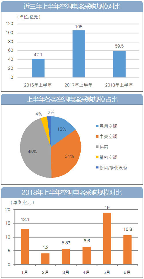 上半年,全國共完成空調電器采購項目數(shù)量逾2000個,采購總金額約59.5億元。從產(chǎn)品上來看,其中,以空氣源熱泵機組為主的冬季清潔取暖設備采購額26.8億元,占比45%;中央空調和民用空調采購市場也有不俗表現(xiàn)。本期,我們將為您詳細分析上半年空調電器采購情況。