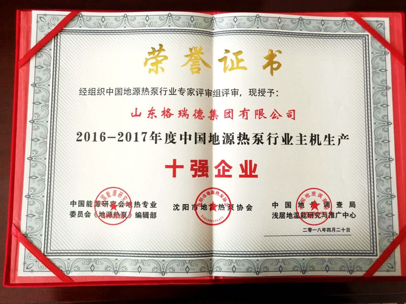 2016-2017年度中國地源熱泵行業(yè)主機(jī)生產(chǎn)十強(qiáng)企業(yè)榮譽(yù)證書