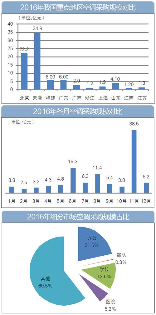 從2011年的30億元、2012年的40.36億元、2013年的46.7億元……到2016年的100.5億元,我國空調(diào)采購規(guī)模五年翻了兩番?!懊焊碾姟表?xiàng)目、各地批量集中采購項(xiàng)目和中央空調(diào)采購等大項(xiàng)目的層出不窮,讓政府采購空調(diào)市場月均采購額超過8元,也讓天津、北京等地出盡風(fēng)頭。而這背后,與政策的支持密不可分。本期,我們將為您詳細(xì)介紹2016年的政府采購空調(diào)市場。