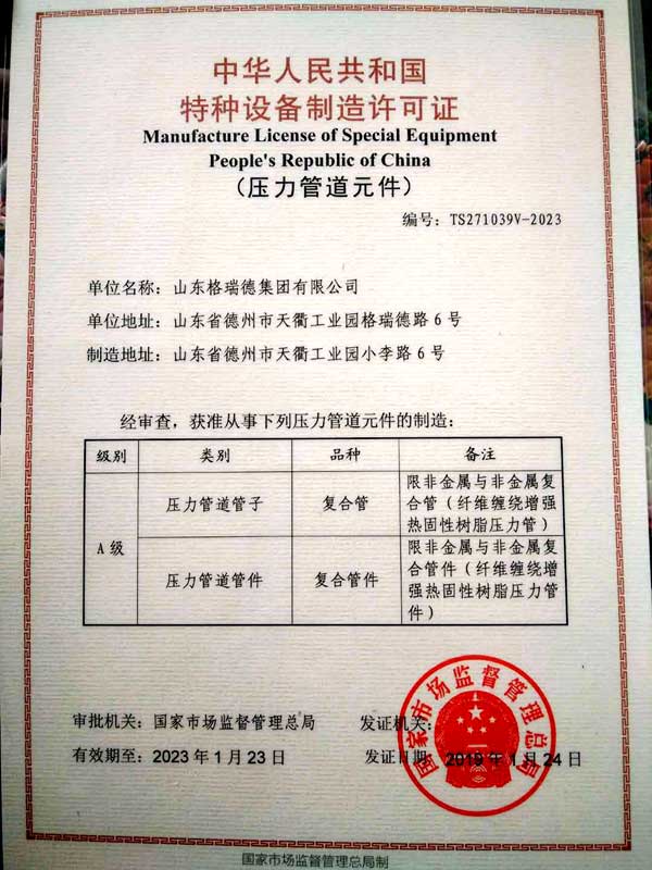 2018年7月,根據(jù)當(dāng)前玻璃鋼管道工程的承攬需求,格瑞德集團(tuán)纏繞公司董作軍總經(jīng)理提出辦理壓力管道元件特種設(shè)備制造許可證的要求,自2018年7月31日正式向國(guó)家市場(chǎng)監(jiān)督管理總局提交許可申請(qǐng)書(shū)到2019年1月24日正式發(fā)證,歷經(jīng)6個(gè)月。6個(gè)月的時(shí)間里,在纏繞公司各個(gè)部門通力合作、集團(tuán)公司相關(guān)部門的大力支持下,順利完成了特種設(shè)備質(zhì)量保證手冊(cè)、特種設(shè)備程序文件、相關(guān)作業(yè)文件、相關(guān)管理制度的編制工作;完成了產(chǎn)品的試制及實(shí)驗(yàn)工作;并于2018年11月15日至16日順利通過(guò)中國(guó)工業(yè)防腐蝕技術(shù)協(xié)會(huì)的現(xiàn)場(chǎng)審核工作。